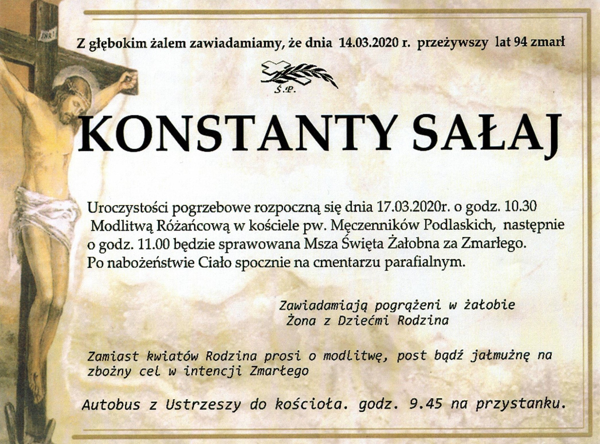 Ks. kan. Janusz Sałaj, proboszcz parafii pw. Św. Filipa Neri w Kąkolewnicy zawiadamia o śmierci swojego ojca śp. Konstantego Sałaja (+94 l.).